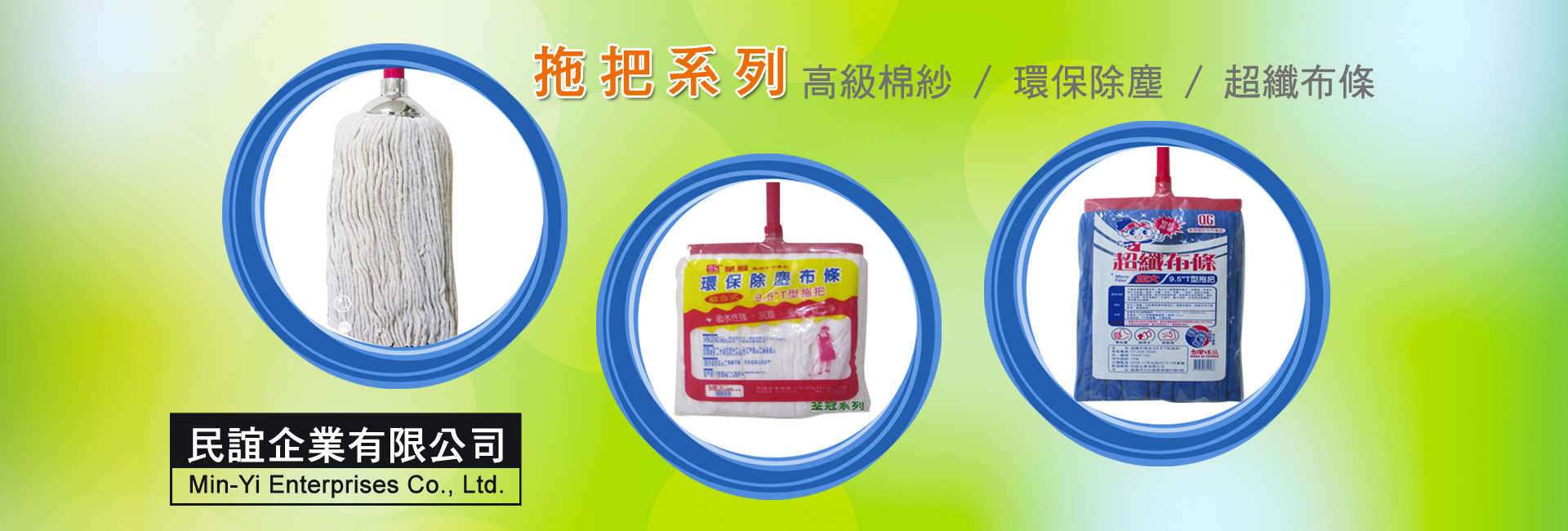 從傳統式(三圈鐵絲與四圈鐵絲)的拖把,隨著環保意識抬頭及延長拖把使用壽命,民誼特別研發了、環保除塵拖把及超細珍珠拖把和替換式拖把、組合式DIY拖把,傳統式拖把,抹布,汽車清潔布,清潔布,廚房用布,洗澡浴巾,廚房清潔布,質多元化,歡迎來樣開發,接受OEM之委託。